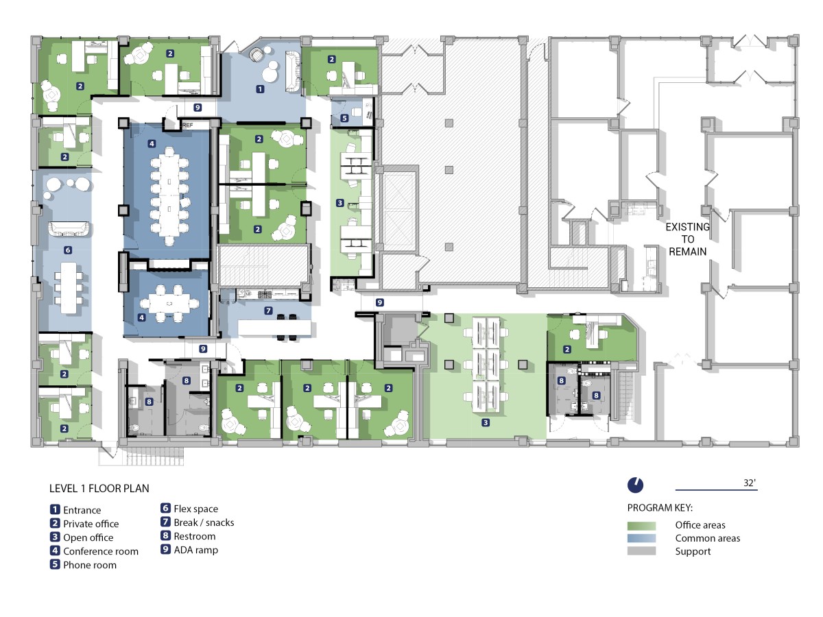 The renovation combined several separate tenant spaces into one functional office with a highly efficient floor plan arrangement. The design prioritizes easy circulation and the feel of an open office — while also allowing for visual and acoustic privacy. The interior design reveals & restores original terrazzo floors, renews window openings covered by prior renovations, and celebrates the historic detailing of the original architecture.