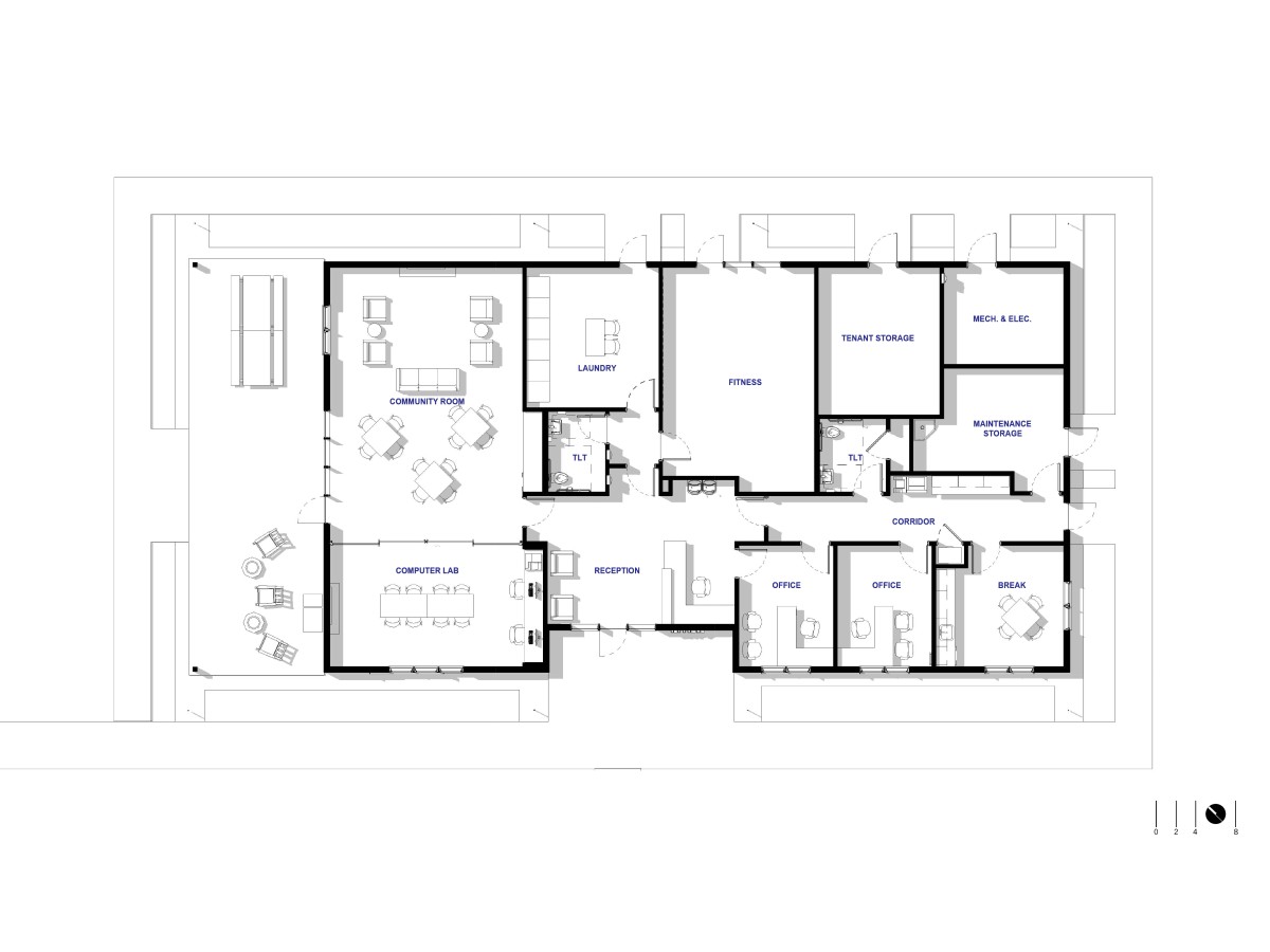 The community center has flexible gathering space for supportive programs, laundry facilities, and an exercise area for residents, as well as staff offices. Vaulted wood trusses create a covered outdoor gathering area at one end of the straightforward massing strategy. Inside, wood trusses reappear as a design element while simple material choices and massing allow for flexibility in uses.