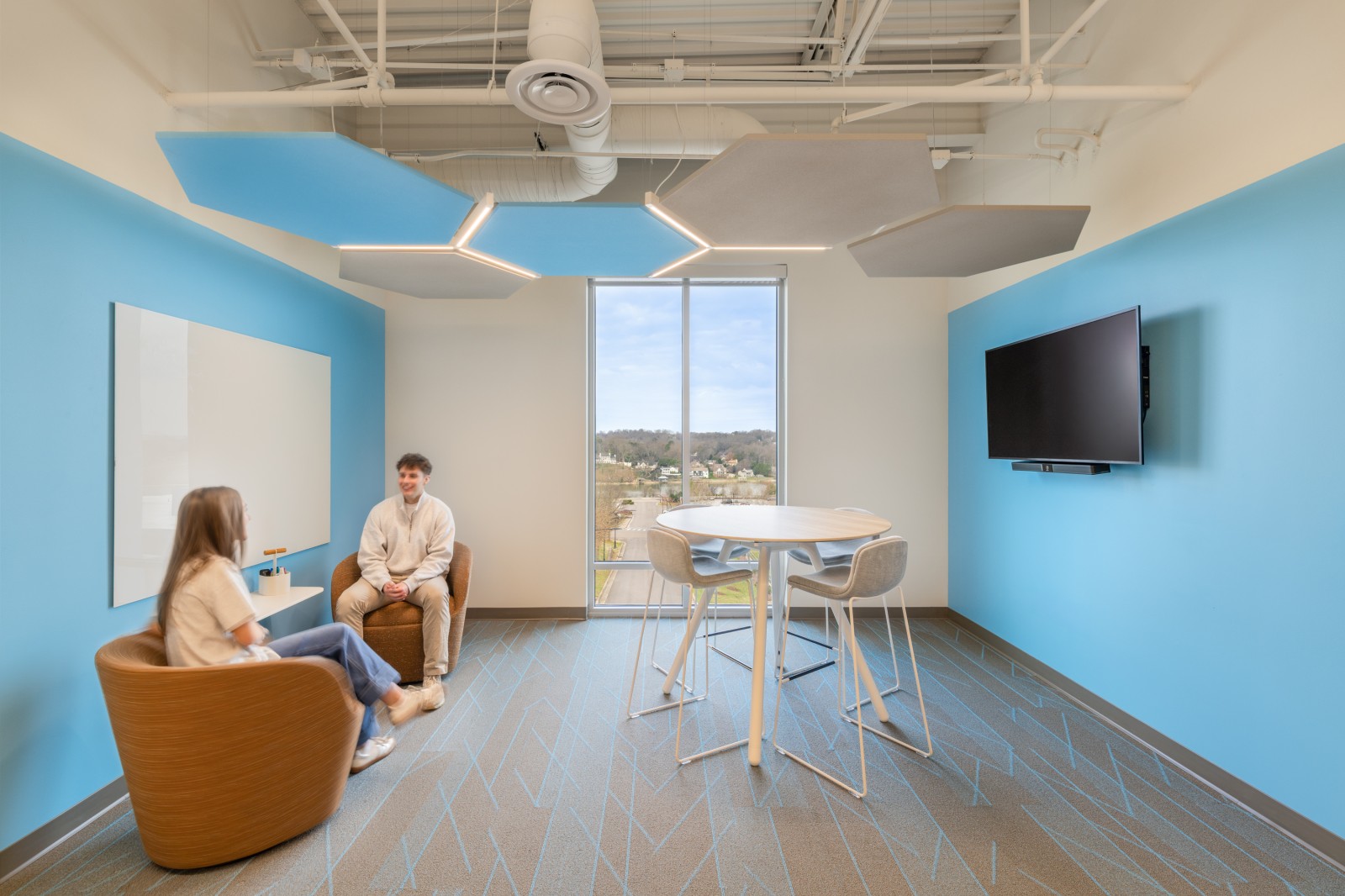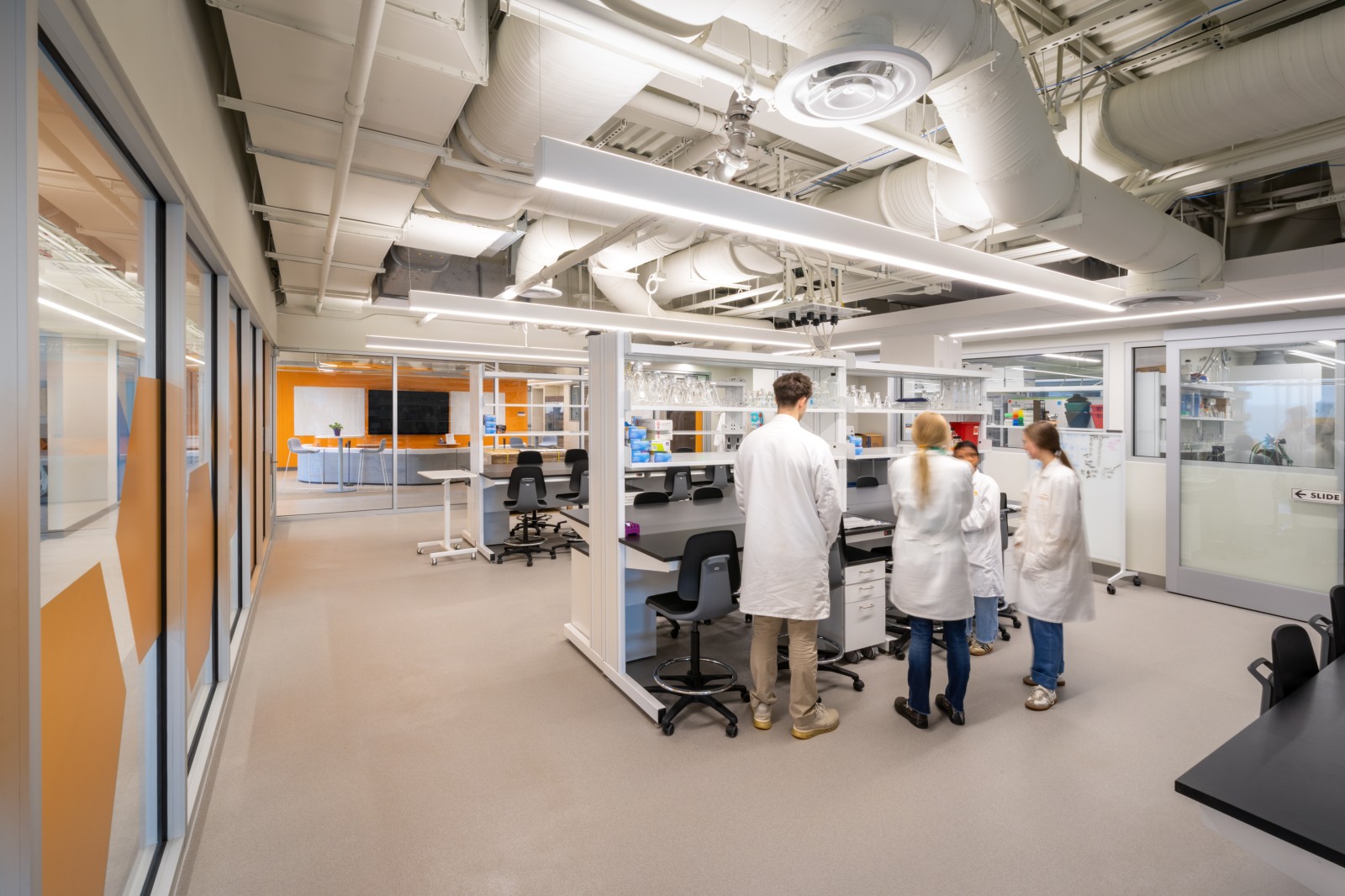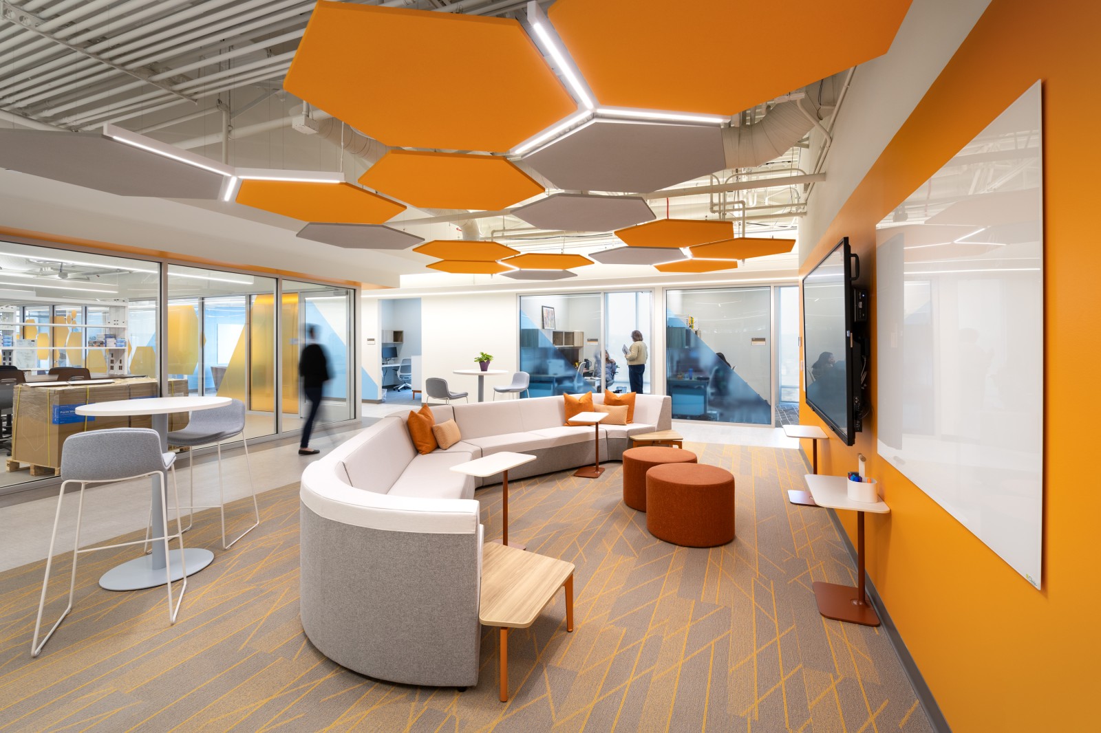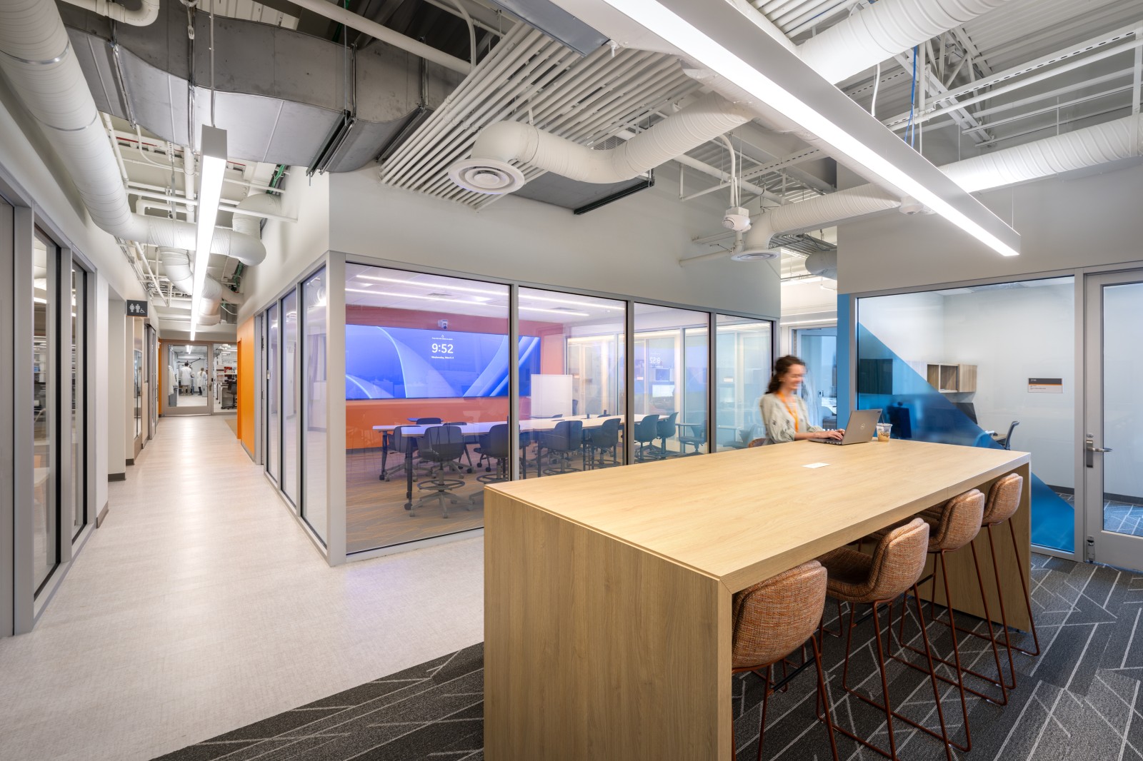 Throughout the space, vibrant colors and dynamic patterns invigorate the interiors, while thoughtfully designed workstations support both focused research and collaborative learning. Key elements, like the integration of glass walls, not only enhance visibility across the space but also showcase the active research happening within. This combination of transparency and light supports the PHE’s goal of fostering an environment that motivates, excites, and reflects the cutting-edge nature of precision health research.